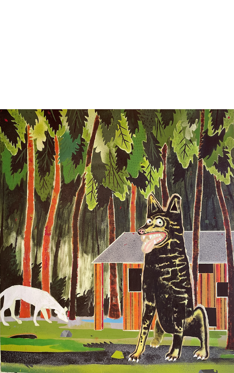 Formalism collides with a punk rock sensibility. His pop culture mash-ups explore the liminal space between the natural and built environment. The animal kingdom acts as our proxy, as his paintings are noticeably devoid of the human figure, replaced by a colourful bestiary cavorting in fantastic landscapes that echo scenes from speculative fiction.