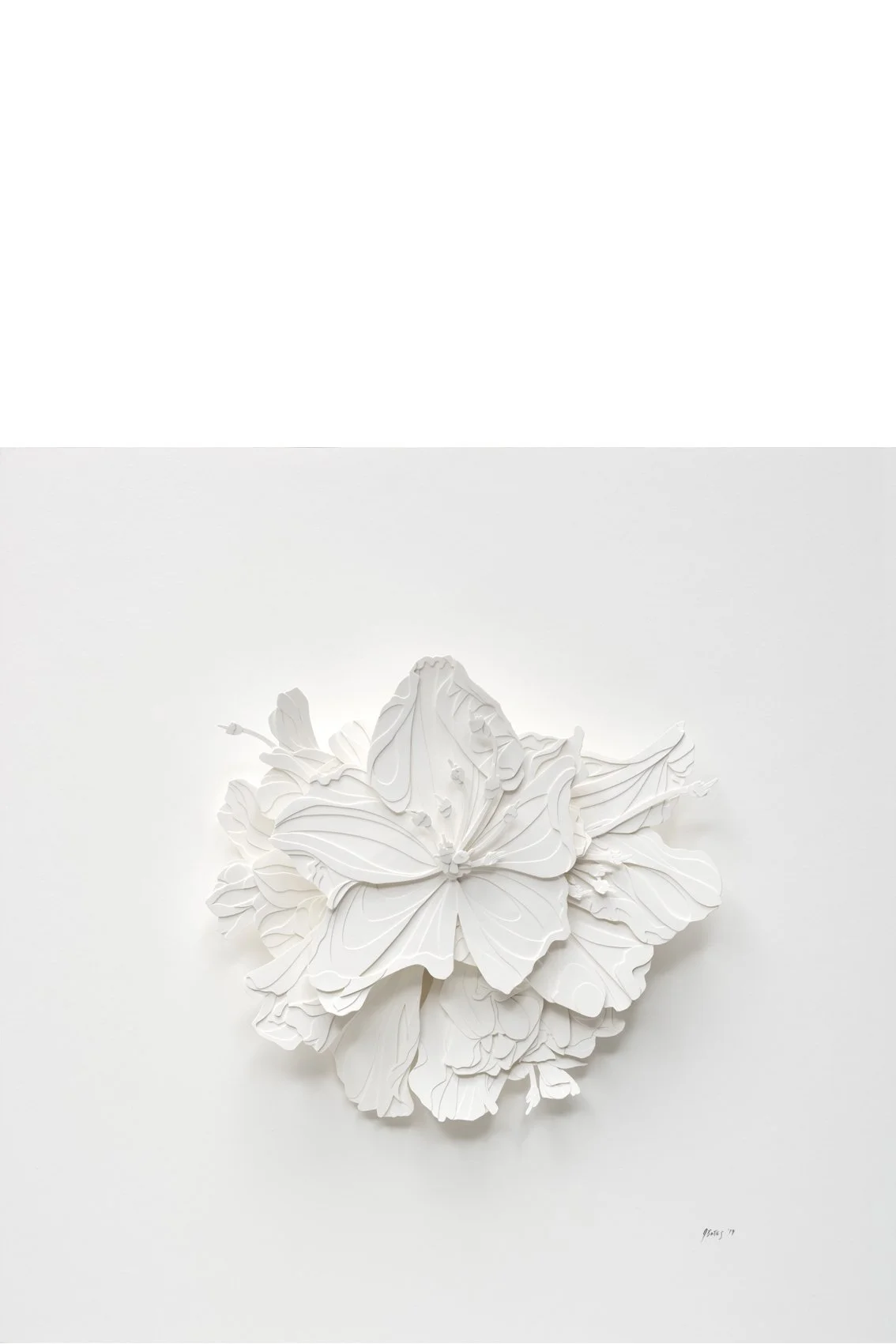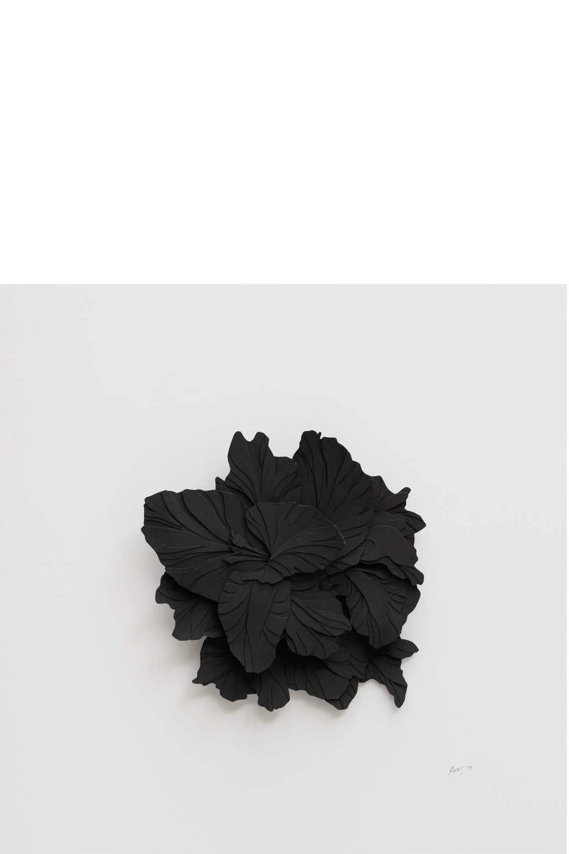 Energy dispersal and change are the impetus for Bates’ recent works. Most pieces reference a volcanic explosion or amalgamation of explosions to recall disruption, destruction, and eventual renewal. The flowers lend a patina of beauty and ease to a process that is jarring, disorienting, and happening constantly — whether or not we are paying attention.